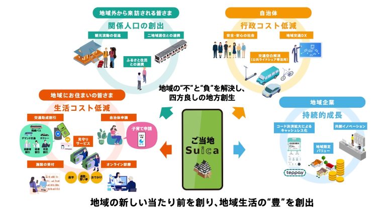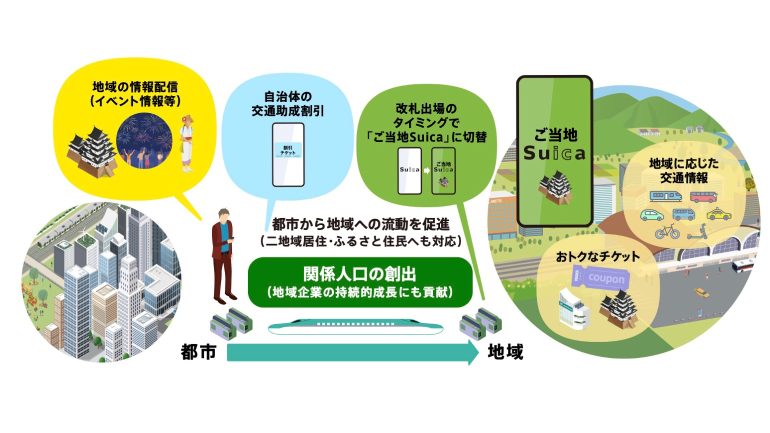 さらに「ご当地Suica」は地域の情報配信チャネルとなり、都市と地域を繋いでいく。二地域居住やふるさと住民へも対応することで、都市から地域への関係人口の創出や移住を促進。