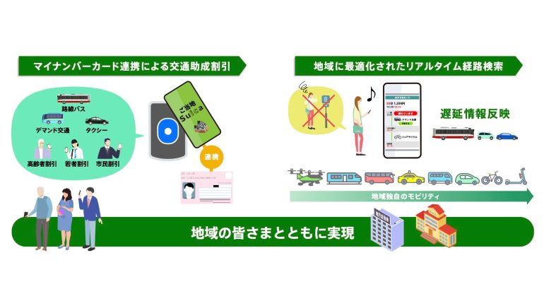 具体的には、Suicaをタッチするだけで居住地・年齢等に応じた交通助成割引を受けることが可能となる。また、通常の経路検索に加えて、地域独自のモビリティ(デマンド交通やシェアサイクル等)を含めエリアを網羅したリアルタイム経路検索(※)とシームレスな予約を実現。