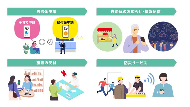 さらに、給付金申請のほか、自治体からのお知らせや公共施設・医療機関の受付、避難所での入退管理による効率的な救援物資の配布や安否確認等の防災サービスまで、地域生活に不可欠な情報連携・利用サービスを一体で提供することを目指す。