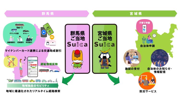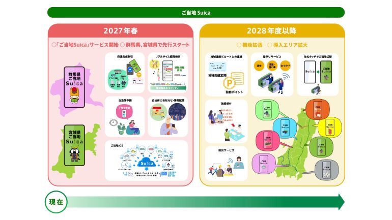 2027年春に群馬県内と宮城県内で「ご当地Suica」を先行スタートとなる予定。同社では「JR東日本グループのSuica、群馬県で育まれたMaaS(GunMaaS)、宮城県で実装されている生活サービスを組み合わせることで『ご当地Suica』を実現し、両県における新しい当たり前を創ります」と述べている。