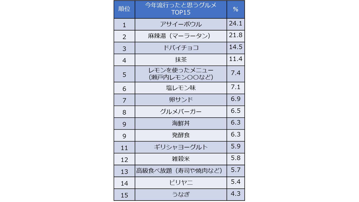 *「今年流行ったと思うグルメ」で提示された選択肢:麻辣湯(マーラータン)、豚汁、海鮮丼、炉端焼き、雑穀米、食べる味噌汁、うなぎ、野菜炒め、ビリヤニ、タコス、かさまし、卵サンド、出し巻卵、ポーク卵、バクテー、ギリシャヨーグルト、フラン、カヌチュロ、タンフル、発酵食、トリュフ、ふりかけ、ジンギスカン、ジャークチキン、グルメバーガー、ドバイチョコ、抹茶、アサイーボウル、よもぎ、高級食べ放題(寿司や焼肉など)、中華バル、“ちゃん系”らーめん、パン飲み(パンとお酒の組み合わせを楽しむ)、日本酒ベースのリキュール(果物などを日本酒で漬けたもの)、食事系クレープ(甘くないおかずクレープ)、塩レモン味、レモンを使ったメニュー(特に瀬戸内レモン〇〇)、そのほか、あてはまるものはない