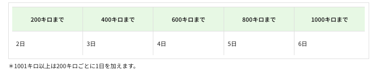 参考までに、下図をイメージするとわかりやすいでしょう。1001km以上は200kmごとに1日を加えます。