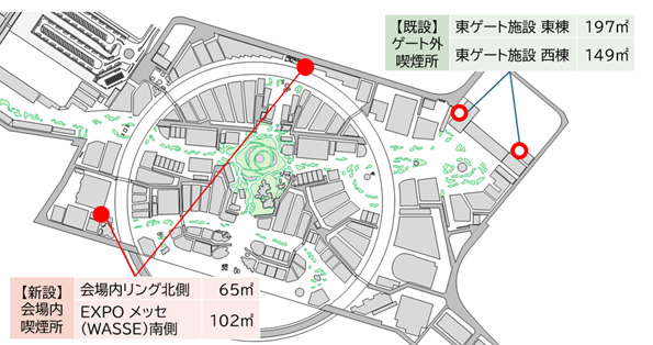 皮肉にも「完全禁煙」が喫煙を管理不能な状態へ追いやり、結果としてたばこの投げ捨てや路上喫煙等のルール違反を招いてしまったと言える。この事態を受け万博協会は、開幕から2か月半を経た6月28日、会場内に2カ所の喫煙所を設置した、というわけだ。
