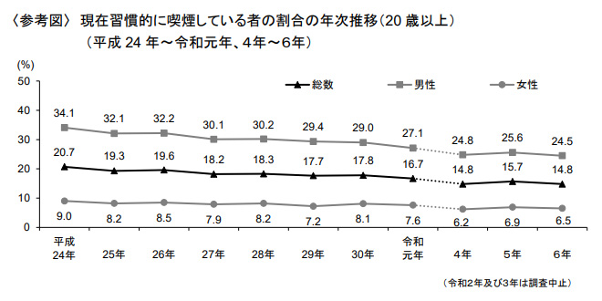 なお、これは「たばこに厳しい国」というイメージがあるシンガポールでも変わらない。同国では、1970年から公共の場所での喫煙規制等を行ってきた。路上喫煙の罰金は、最高で日本円換算10万円超と高額、もちろんたばこには高額な税金もかかっている。しかし喫煙率は男女計約16.4%(WHOによる報告書より、2024年)。これは日本の14.8%(厚生労働省「国民健康・栄養調査」より、2024年)とあまり変わらない。