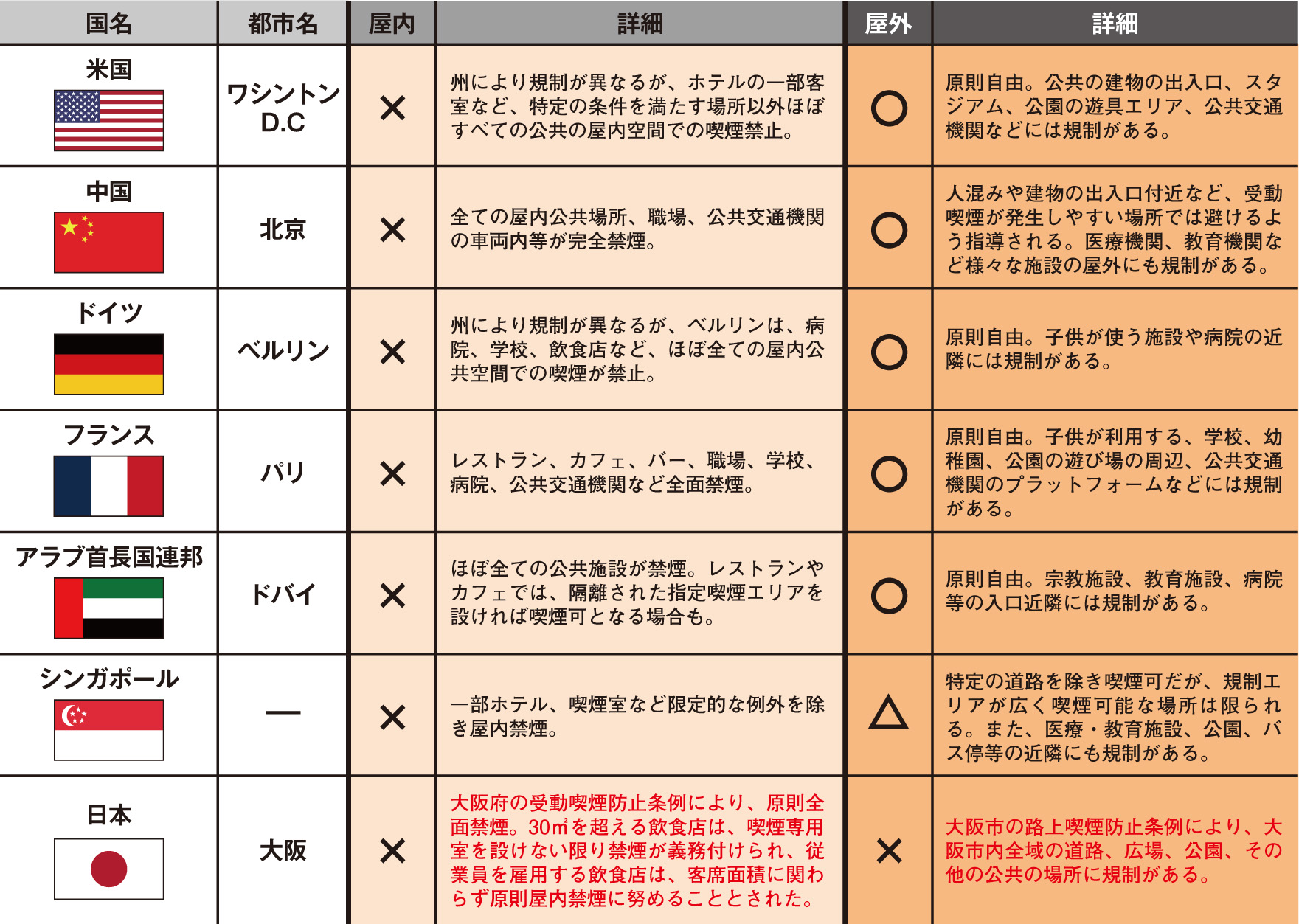 いずれも大阪・関西万博を見据えた動きだったと言われている。内容は国が定めた改正健康増進法よりも厳しい基準で、大阪は 「世界一喫煙に厳しい都市」と報じられた。