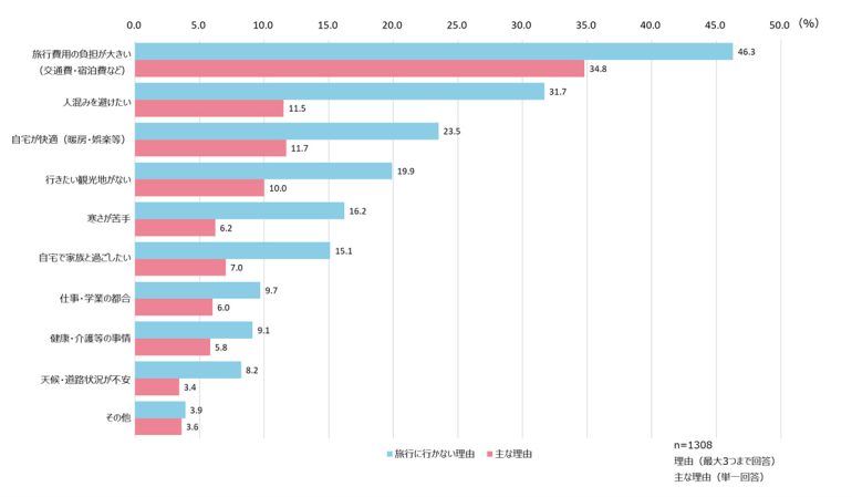 一方「自宅が快適(暖房・娯楽など)」というポジティブな理由は23.5%で、第3位であった。また、主な理由(単一回答)では、「旅行費用の負担が大きい(交通費・宿泊費など)」が34.8%で突出している。