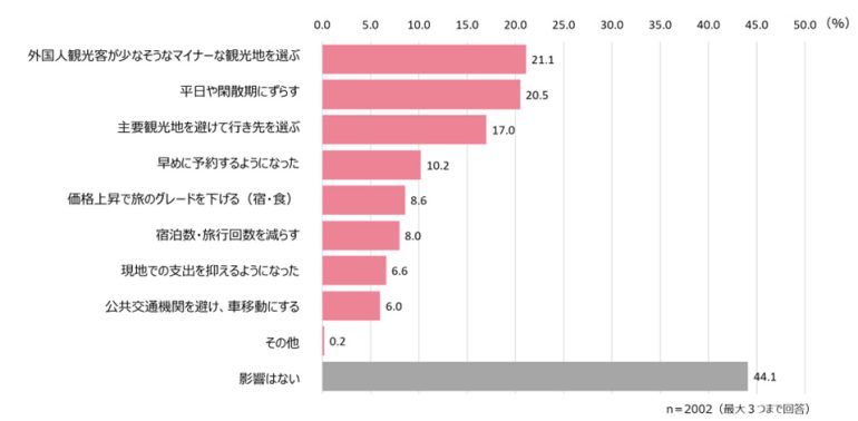 外国人観光客による旅行の影響を回答した人は、55.9%。内訳では、行き先を主要地から外す/マイナー地域へ切り替える、混雑回避のため時期をずらす(平日・閑散期)が上位になった。