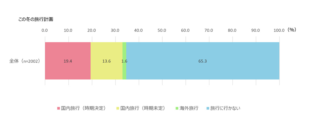 この冬(12~2月)に外泊を伴う旅行の予定があると回答した人は34.6%。内訳では「国内は行かず海外のみ」が1.6%だった。「旅行には行かない」は65.3%で、半数以上が不実施という結果に。年代間の差は限定的で、主要な傾向は一致している。