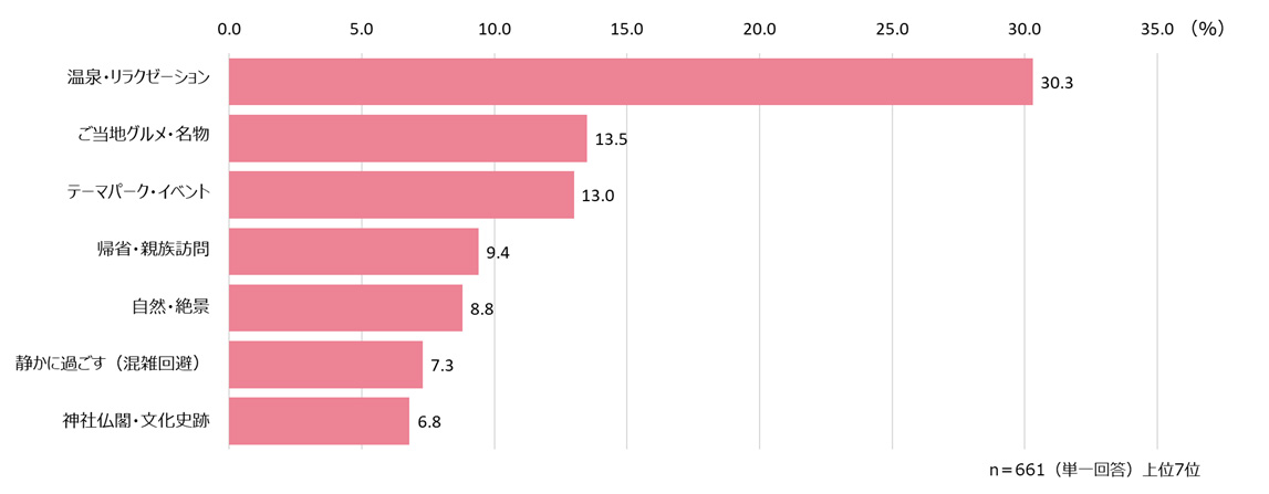 「静かに過ごす(混雑回避)」と回答した人は7.3%で、人との接触や交流を避けて疲れを癒す目的で旅行に行くことが考えられる。