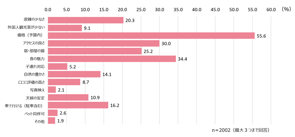 しかし、「外国人観光客が少ない」は9.1%で、旅行計画時の重視度は低い。