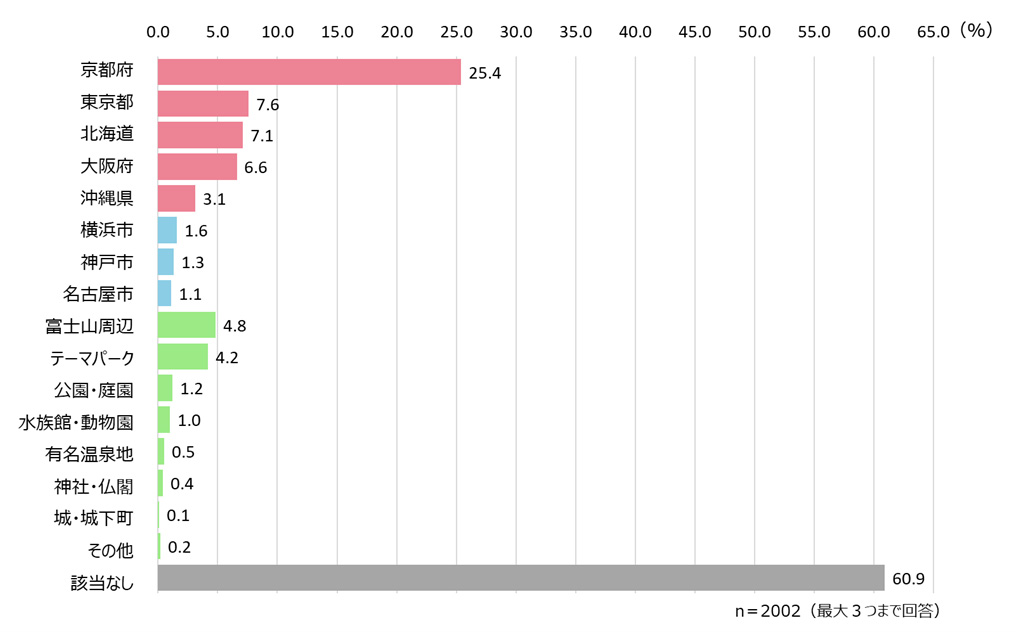 一方、カテゴリでは「温泉地」「神社・仏閣」の割合は相対的に低めであった。自由回答の具体例では、温泉地は「箱根」「城崎」、その他では「鎌倉」「金沢」などが挙がっている。