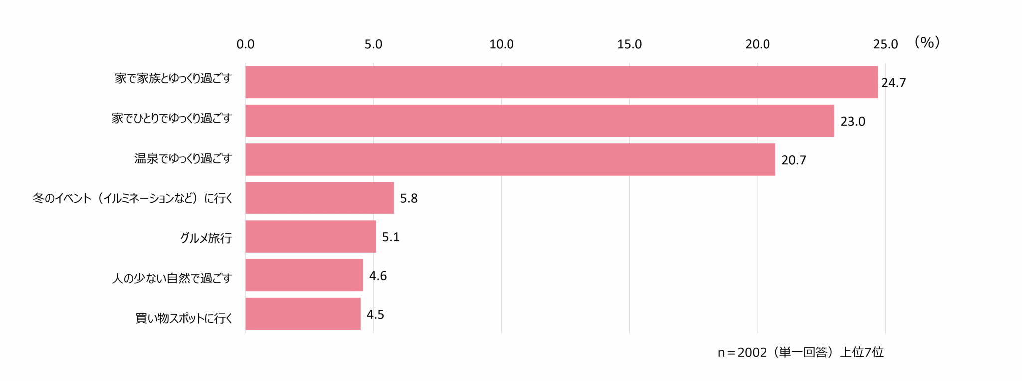 理想の冬の過ごし方は、「家で家族とゆっくり過ごす」が24.7%、「家でひとりでゆっくり過ごす」が23.0%と続き、外出せずに家で過ごしたいと回答した人が多い結果となった。