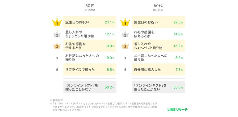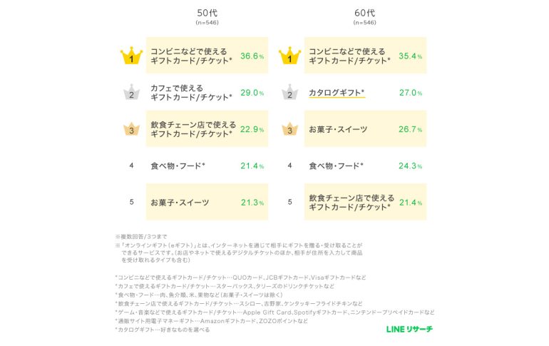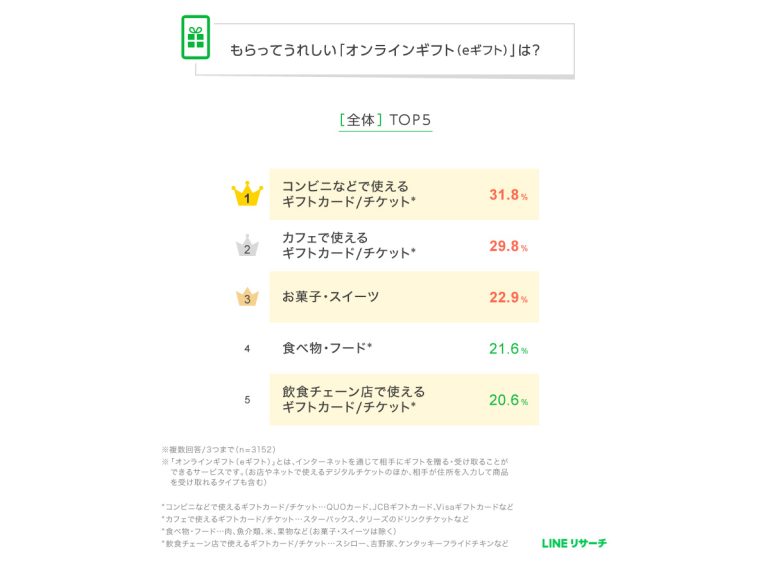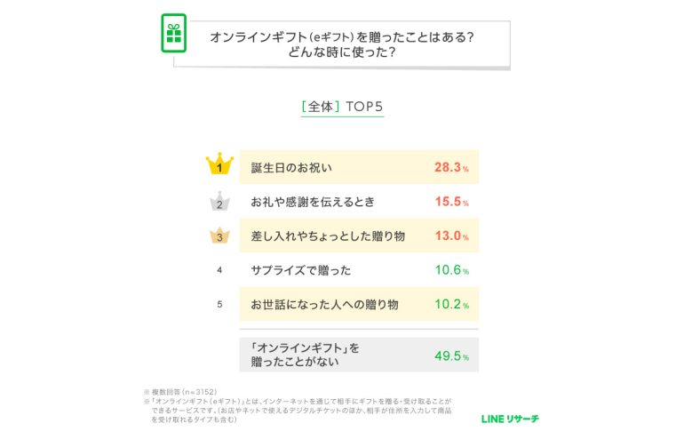 スマートフォン専用のリサーチプラットフォーム「LINEリサーチ」はこのほど、日本全国の15歳~69歳の男女3152名を対象に、オンラインギフト(eギフト)を贈った経験や、もらってうれしいオンラインギフト(eギフト)に関する調査を実施し、その結果を発表した。