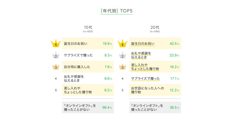 利用率の高い20代では、「お礼や感謝を伝えるとき」「差し入れやちょっとした贈り物」「サプライズで贈った」の割合が、ほかの年代と比べて高くなっていた。