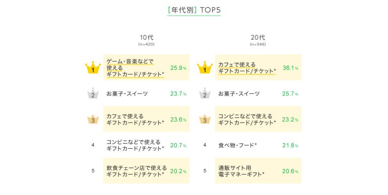 年代別にみると、10代では「ゲーム・音楽などで使えるギフトカード/チケット(Apple Gift Card、Spotifyギフトカード、ニンテンドープリペイドカードなど)」が2割台半ばで1位。特に10代男性では3割強と高い結果となった。