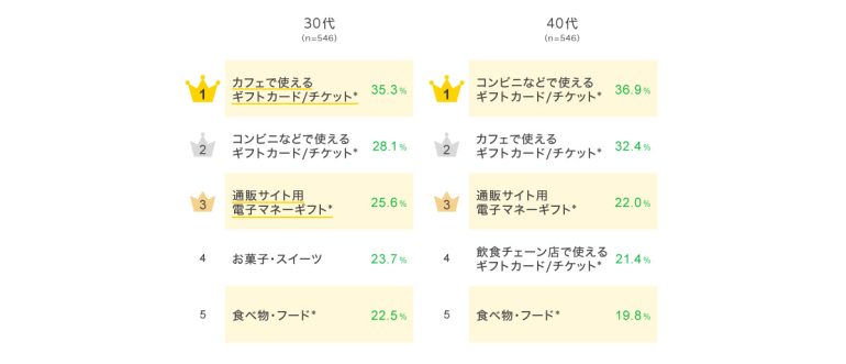 全体では、「コンビニなどで使えるギフトカード/チケット(QUOカード、JCBギフトカード、Visaギフトカードなど)」、「カフェで使えるギフトカード/チケット(スターバックス、タリーズのドリンクチケットなど)」が約3割でTOP2となった。