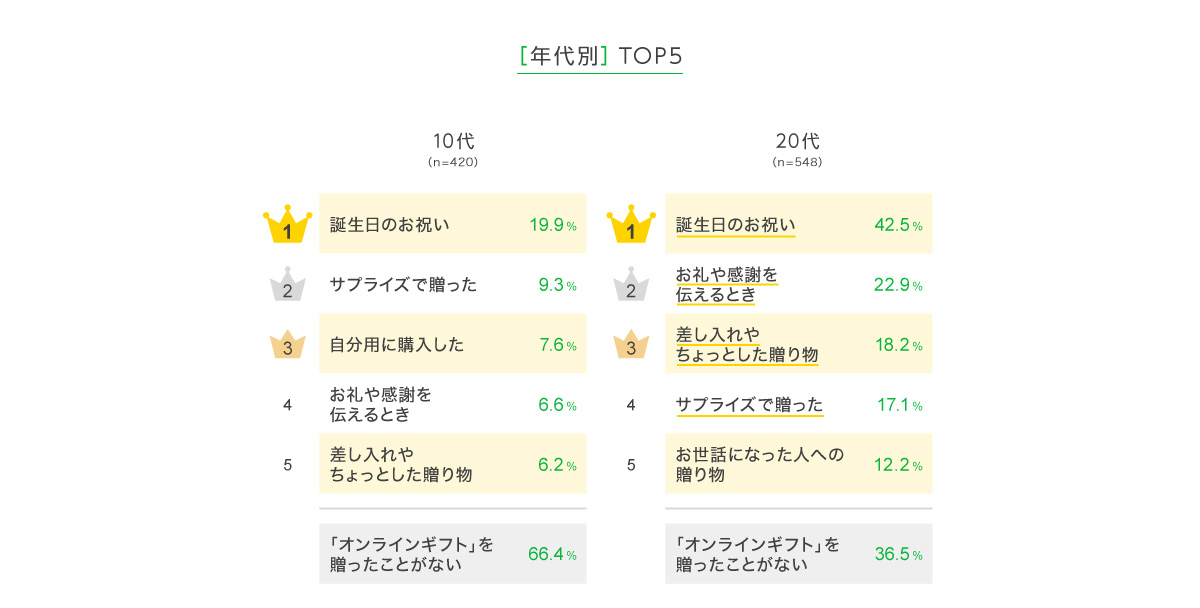 利用率の高い20代では、「お礼や感謝を伝えるとき」「差し入れやちょっとした贈り物」「サプライズで贈った」の割合が、ほかの年代と比べて高くなっていた。