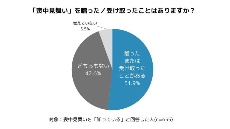 ちなみに「喪中見舞い」を知っている人のうち、51.9%が実際に贈った、または受け取った経験を持っていた。