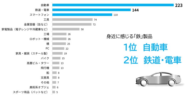 身近に感じる鉄製品では、「自動車」が圧倒的1位だった。2位の「鉄道・電車」を含めて日常の移動手段として活用されている乗物が身近な鉄製品と認識されていた。それに続くスマートフォンや工具、缶などの金属容器も日用品として鉄製品の印象が強いようだ。