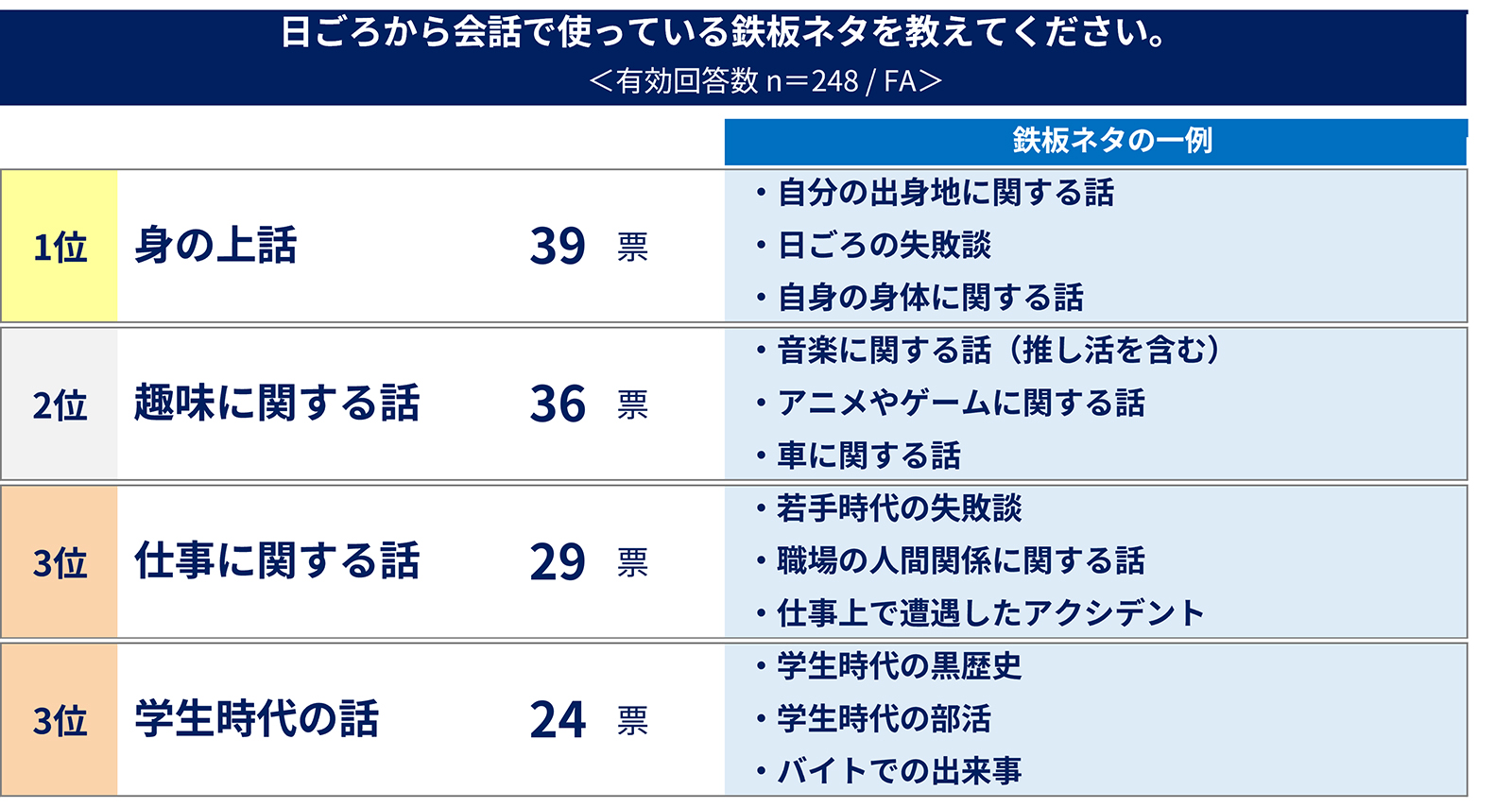 日頃の会話の中で使っている「鉄板ネタ」では「身の上話」が1位だった。内容では、日常で起きた失敗談や自分の出身地など話題にしやすいネタが挙がった。全体的に失敗談を鉄板ネタにする人が多く、円滑なコミュニケーションに有効と思われているようだ。