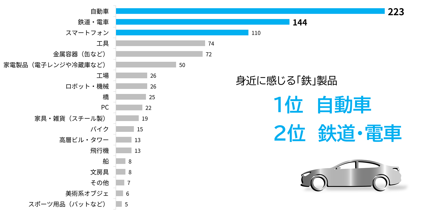 身近に感じる鉄製品では、「自動車」が圧倒的1位だった。2位の「鉄道・電車」を含めて日常の移動手段として活用されている乗物が身近な鉄製品と認識されていた。それに続くスマートフォンや工具、缶などの金属容器も日用品として鉄製品の印象が強いようだ。