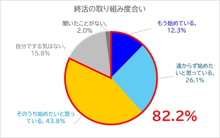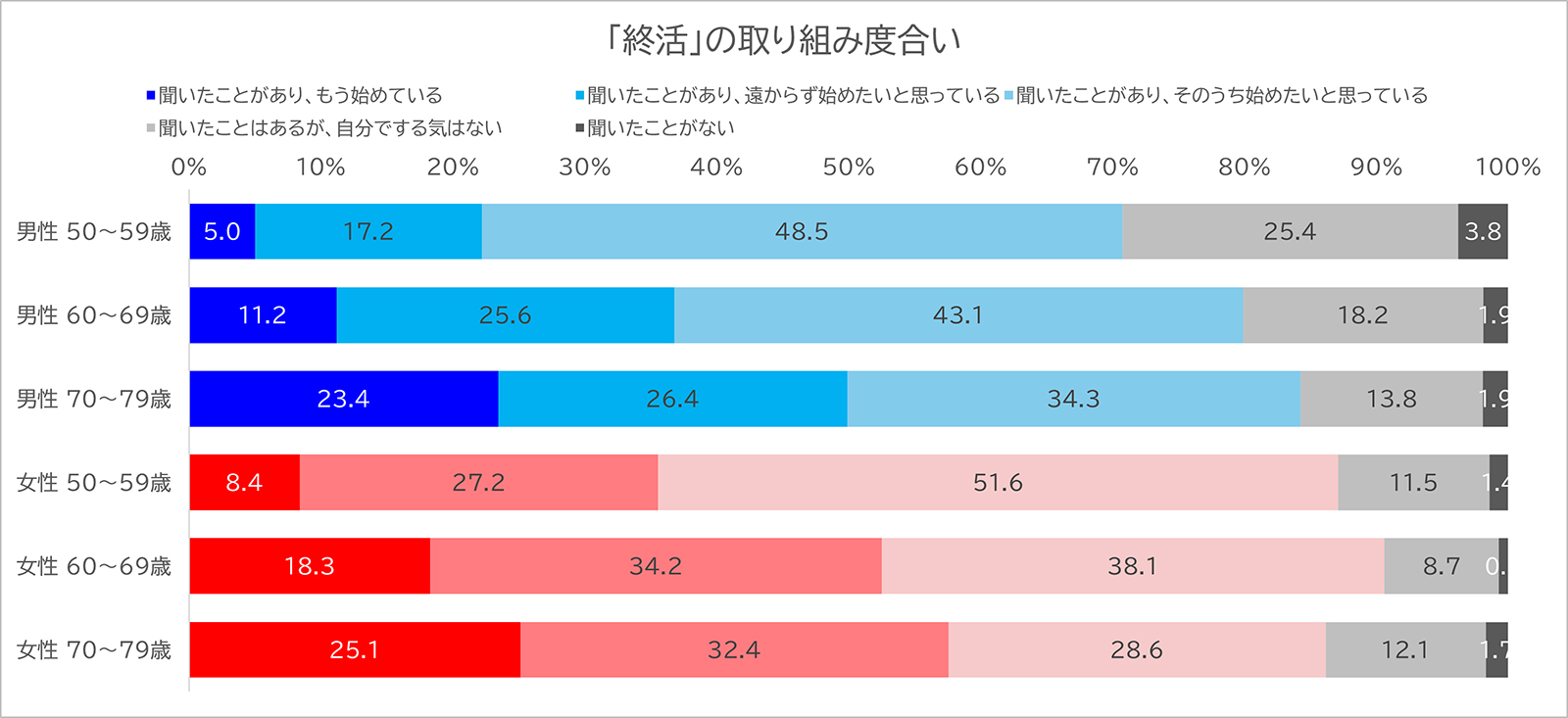 「終活の取り組み度合い」については、シニア全体で「終活を始めたいと思っている」層は8割を超えていた。年代別では、年齢が上がるほど終活への意識が高まり、実際に行動へ移している人も増えている。男女別では、どの年代でも女性の方が「すでに終活を始めている」と回答している割合が高かった。