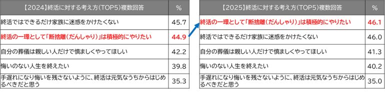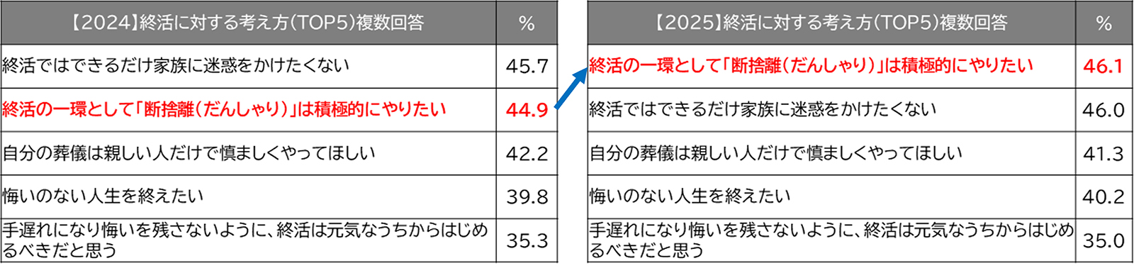 複数回答で「終活に対する考え方」を質問すると、「終活の一環として『断捨離』は積極的にやりたい」という項目は、2024年には「終活ではできるだけ家族に迷惑をかけたくない」(45.7%)に次ぐ44.9%で2位だったが、2025年は1.2ポイント上昇して46.1%で1位になった。家族への配慮はもちろんだが、“自らの意思で前向きに終活へ取り組む”シニアが増えていることが浮き彫りになった。