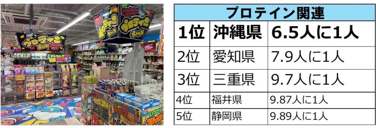 ランキングは1位沖縄県、2位愛知県、3位三重県いう結果に。1位となった沖縄県では、この1年間で県民の6.5人に1人はプロテイン関連商品を買ったことがある計算となった。