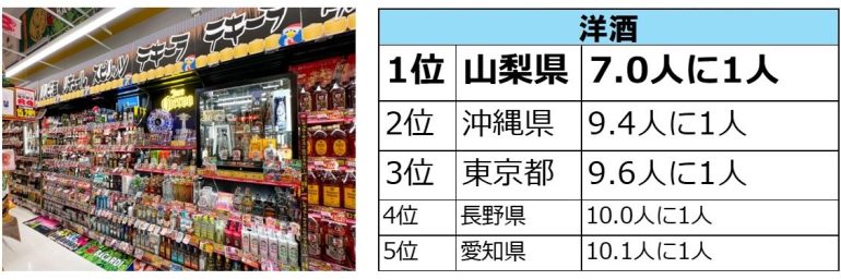 ランキングは1位山梨県、2位沖縄県、3位東京都という結果となり、山梨県では、この1年間で県民の7人に1人が洋酒を買ったことがある計算となった。