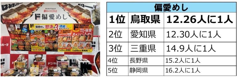 ランキングは1位鳥取県、2位愛知県、3位三重県という結果に。紅生姜に続いて、1位となった鳥取県では、この1年間で県民の12人に1人はドン・キホーテ店舗で偏愛めしを買ったことがある計算となった。