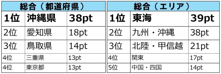 また、地域別でみると、東海エリア(静岡県、愛知県、岐阜県、三重県)が1位を獲得。以下、九州・沖縄、北陸・甲信越と続いた。