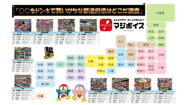 「○○をドンキで買いがちな都道府県はどこだ!調査」は、今年、47都道府県すべてに出店を果たしたドン・キホーテが“○○といえばドンキ”と言えるような強みを持つ得意な商品カテゴリー10部門を選出し、それぞれをよく購入している都道府県をランキング化したもの。公式の「majica」アプリ内にある、商品評価・レビュー機能のサービス「マジボイス」での書き込み傾向や、売上の高い商品などをもとに当社独自で分析しているという。