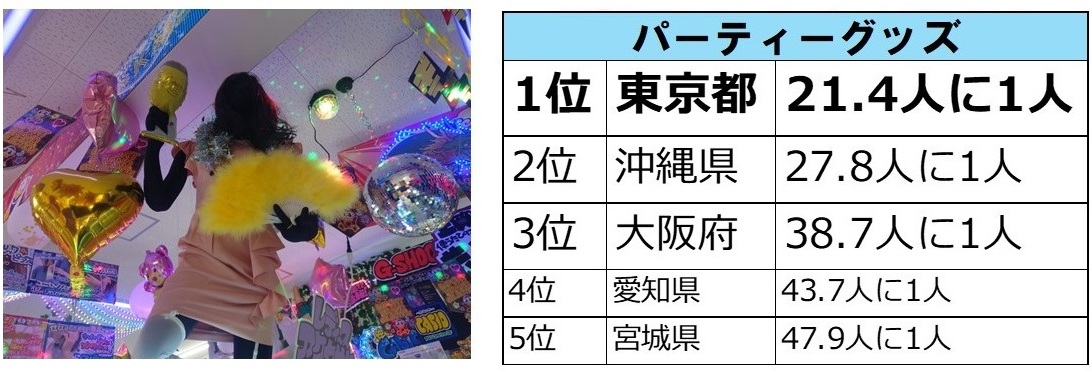ランキングは1位東京都、2位沖縄県、3位大阪府という結果に。1位となった東京都では、この1年間で都民の21人に1人はパーティーグッズを買ったことがある計算となった。店舗別にみても全国売上トップ10のうち6店舗が都内店舗だという。