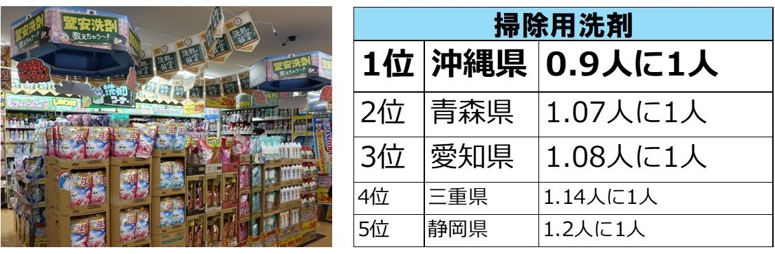 ランキングは1位沖縄県、2位青森県、3位愛知県となり、1位となった沖縄県では、この1年間で県民の0.9人に1人は掃除用洗剤を買ったことがある計算となった。