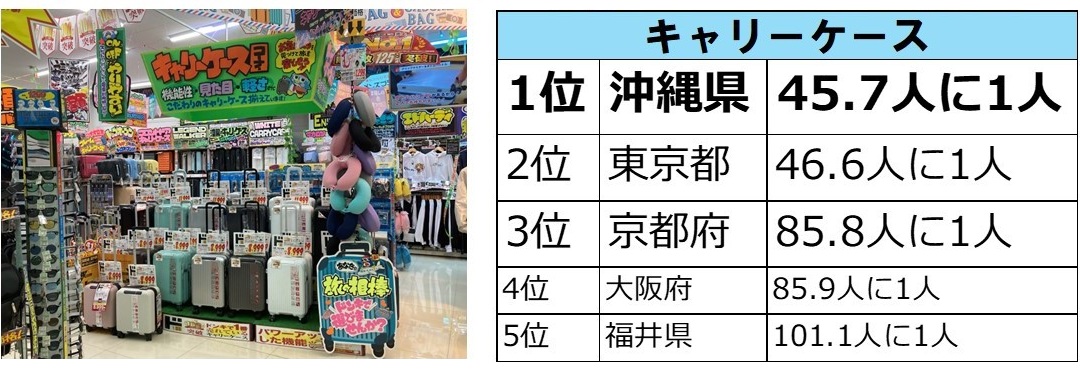 ランキングは国内外問わず多くの観光客が訪れる都府県が上位に入る結果に。1位となった沖縄県では、この1年間で県民の45人に1人はキャリーケースを買ったことがある計算となった。