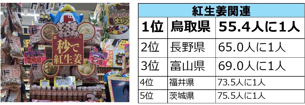 ランキングは1位鳥取県、2位長野県、3位富山県、4位福井県、5位茨城県となり、2~4位には北陸・甲信越の3県がランクインするという結果に。1位となった鳥取県では、この1年間で県民の55人に1人が同社オリジナルの紅生姜○○を買ったことがある計算となった。