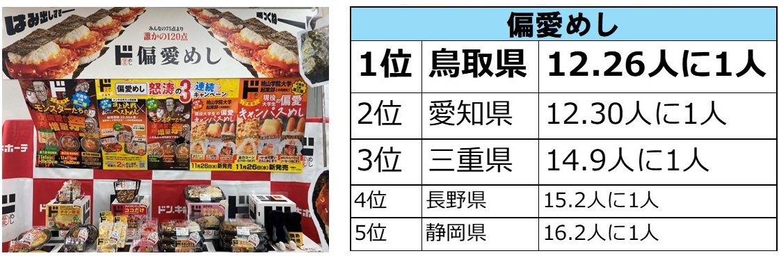 県内にドン・キホーテ店舗(鳥取本店、MEGAドン・キホーテ米子店)が2店舗しかない中での1位獲得は驚きの結果。鳥取県は海と山、両方の幸が豊富で、比較的優しい味の郷土料理が多いと言われる中で、刺激が強く濃い味が多い偏愛めしが、逆に新鮮で受け入れられたのはないかと考えられる。