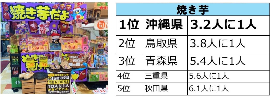 ランキングは1位沖縄県、2位鳥取県、3位青森県となり、1位となった沖縄県では、この1年間で県民の3.2人に1人が焼き芋を買ったことがある計算となった。