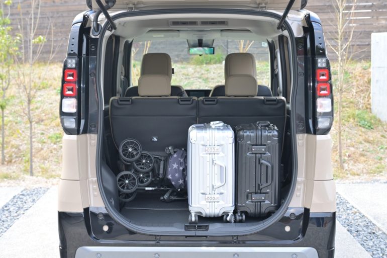 今回の“わんこと行くクルマ旅”の乗車フォーメーションは、前席にボクたち夫婦、DOG DEPTのドッグベッドを設置した後席右側に愛犬のアーモンドが乗車。後席左側に寒さに備えたダウンジャケット2着、後席を前方にスライドさせ奥行きを拡大したラゲッジルームに機内持ち込みサイズのキャリーケース2個、折り畳み式ペットカートなどを積み込みました。ラゲッジルームはこのほかにもアーモンド用の荷物、保冷バッグも入る余裕がありました。ちなみに、新型デリカミニのラゲッジルームの寸法は、実測で開口部地上高620mm(4WD。2WDは590mm)、奥行き290~675mm(320mmの後席スライド位置による)、最小幅885mm、最低天井高1070mm~と、後席使用時でも広大。開口部地上高の低さ(4WDの620mmでも世界のステーションワゴンの平均値より低め)によって、キャリーケースやペットカートの出し入れも楽々です。今回ラゲッジフックも採用し、片側3か所(1個当たりの耐荷重は3kg)、左右6か所あるフックで、荷崩れなどを防ぐネットを取り付けることができ荷室の使い方を広げてくれます。