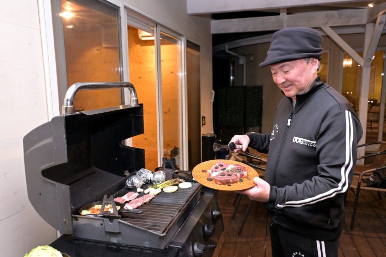 午後6時。コテージCでのプレミアムBBQプランのスタートです。テラスにあるBBQコンロはガス式なので、BBQの素人でも簡単に始めることができます。今夜のメニューは茨城県産銘柄黒毛和牛『常陸牛』サーロインステーキ、熟成肉3種盛り トリュフ乗せ、奥久慈しゃも、筑波ハムのシャルキュトリー、魚介ブイヤベース、新鮮野菜のスキレット、バケット、そしてデザートの小美玉プリンという豪華なものでした。