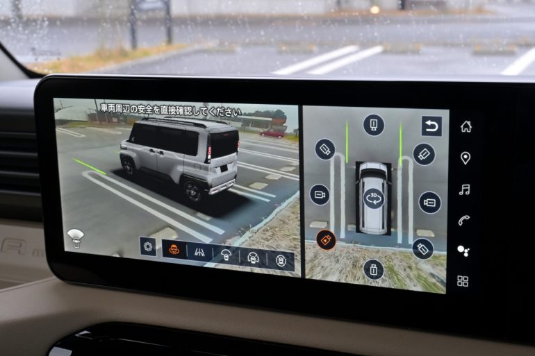 パッケージ(前後席空間、ラゲッジスペース)については先代から大きな変更はないものの、室内空間は依然、スーパーハイトワゴンクラスのトップレベルの広さ、機能性、高品質感を備えています。とくに、角度を立てたフロントウインドー(Aピラー)によって前席周りの広々感はさらに高まり、12.3インチの大型ディスプレーに軽自動車初のGoogle搭載ナビゲーションを採用したことも大きな特徴。実際、前席の広々感はさらに高まり、全方位の視界の良さもあって、走り始める前から爽快なドライブを予感させてくれるのです。