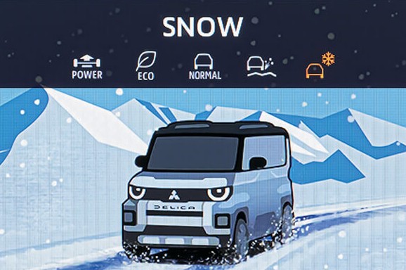 5つのモードそれぞれを紹介すると、加速の力強さとアクセルレスポンスを高めたパワフルな走り、高速道路の追い越しなどで役立つ「パワーモード」。アクセルレスポンスを穏やかにすることで、エコで経済的な走りをサポートし、愛犬を乗せているときにも最適な「エコモード」。様々な路面環境に幅広く対応する走行性能と燃費性能をバランスよく発揮する「ノーマルモード」。未舗装路や豪雨・新雪でも、路面に左右されない直進安定性、アクセル操作に応じた力強い発進・加速を実現する「グラベルモード」。そしてこれからの季節における役立つ、雪道などの滑りやすい路面でトラクション・コントロールの介入を大きくし安定感ある走りをもたらす「スノーモード」が、ダイヤル操作だけで切り替えられ、画面にデリカミニのそれぞれのイラストが表示されるので、どのモードに切り替わったかは一目瞭然です。