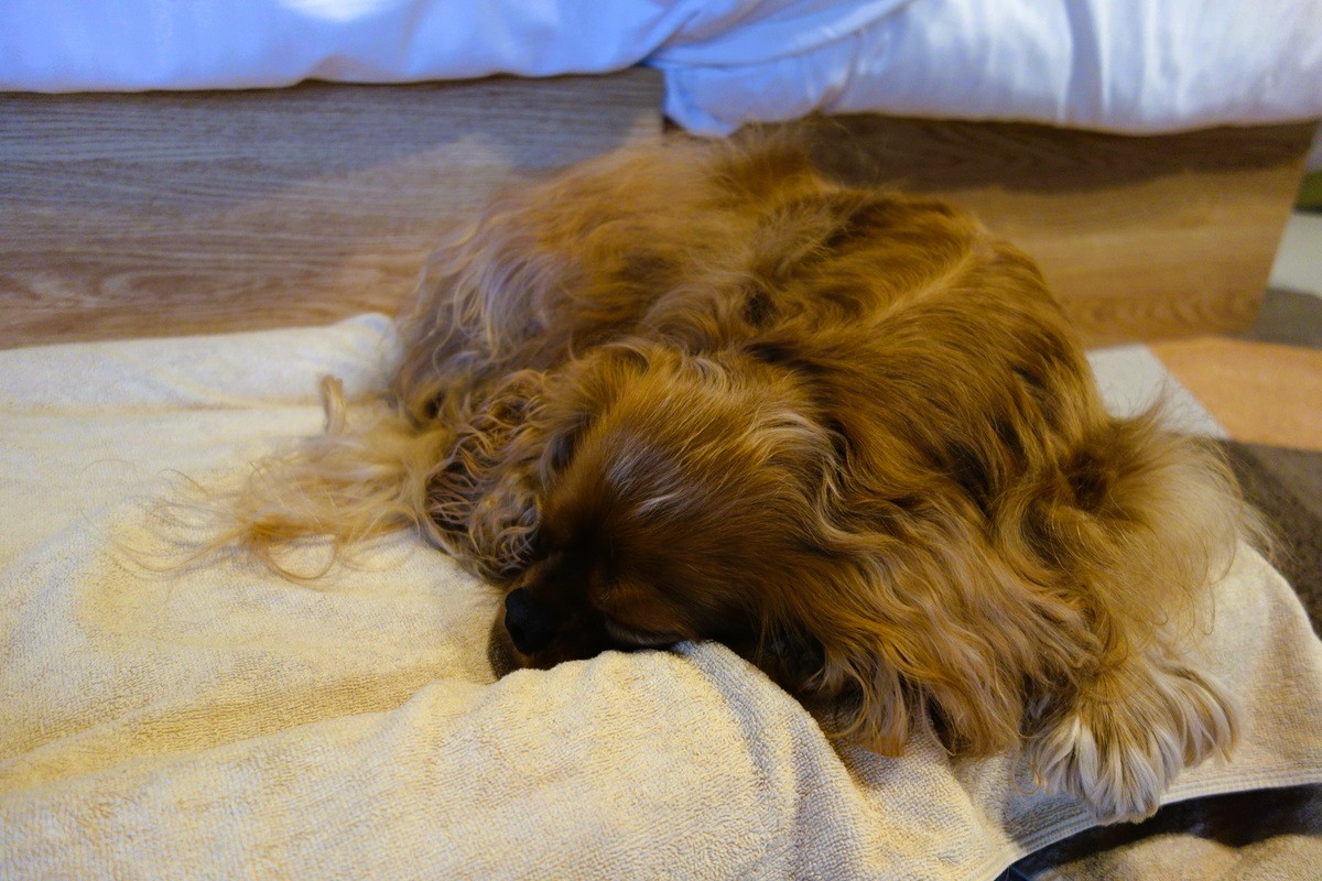 就寝前にはもちろん、アーモンドを今日、最後のお散歩をプライベートドッグランで済ませ、別棟にあるシャワーブースを使ってから黒湯の温泉につかり、今日1日をリフレッシュ。あとは、愛犬と添い寝もOKというベッドに入るだけ。こうして、新型デリカミニ T Premium DELIMARU Packageの4WDモデルで訪れた、グランデプライベートドッグリゾート常陸の「気軽でプレミアムなアウトドア」の1日が終わりました。それじゃあ、アーモンド、おやすみ。あっ、もう、フロアの愛犬用ベッドで気持ちよさそうに寝てるか・・・。