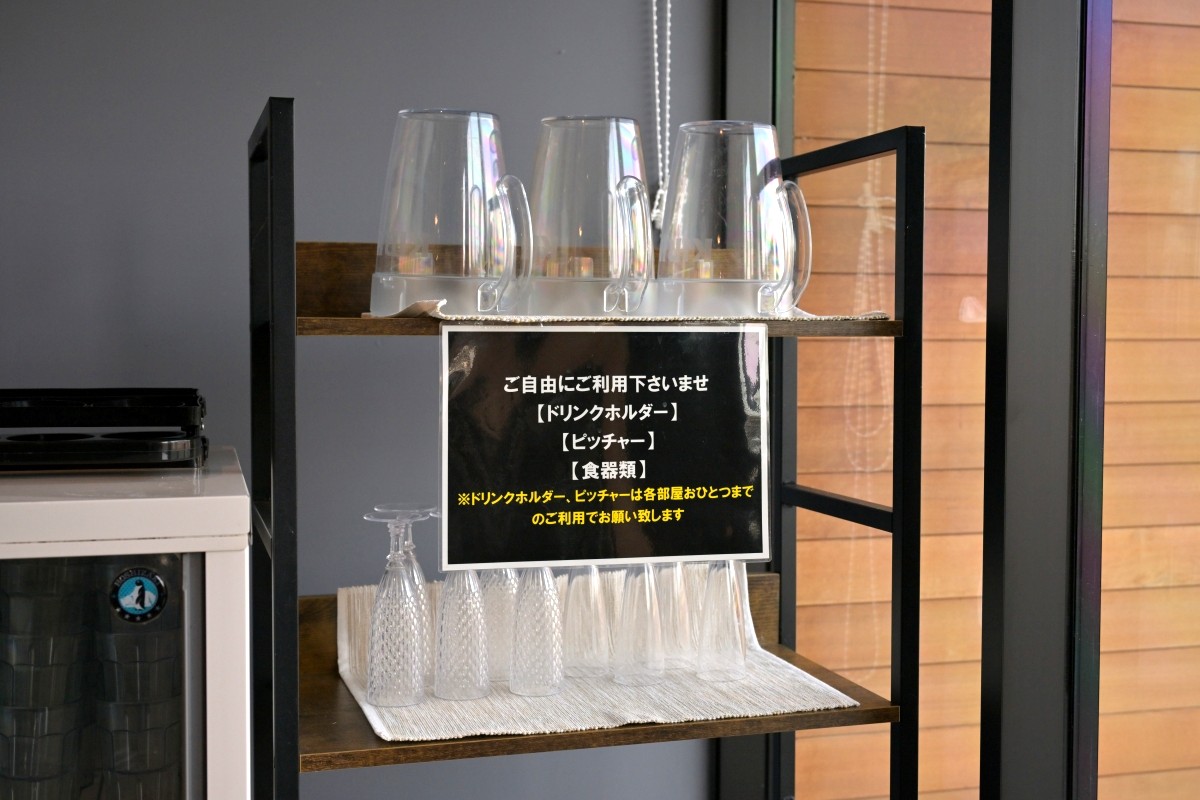 そしてお酒好きの人にはたまらない、「ナイトドッグバー」(17:00~20:00)に用意された、宿泊料金に含まれるウイスキー、ジン、ブランデー、ハイボール、サワー、生ビール、クラフトビールもいただきました。ビールジョッキ、ハイボールなどにぴったりのアルミ製グラスはもちろん、ビール用のピッチャー、複数のグラスを運ぶトレイまで備わっていました。インフォメーションセンター内のテーブルでいただくこともできるのですが、コテージに持ち込んで部屋飲みすることもOKというのですから、太っ腹ですよね。