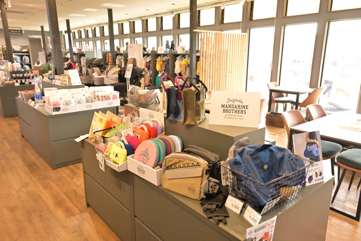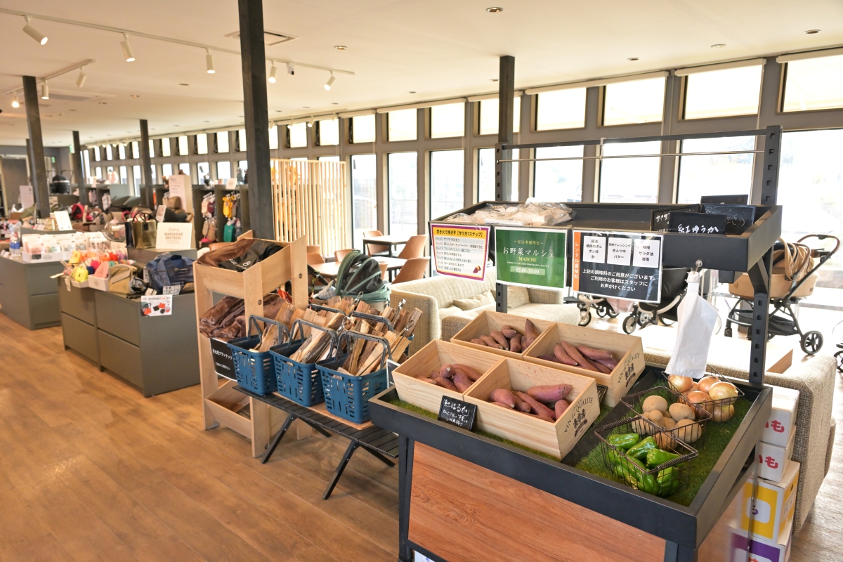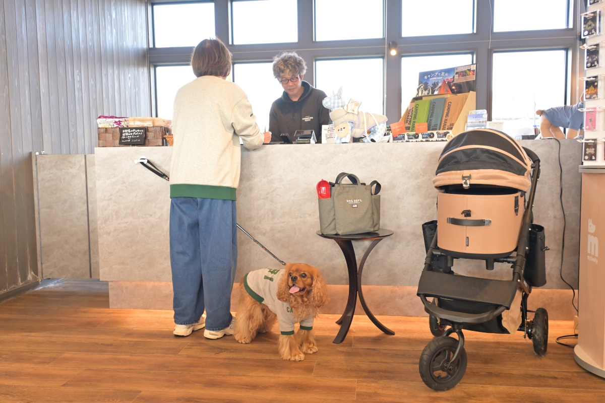 ランチを終えたあと、午後3時のチェックインまで時間があっても、ここグランデプライベートドッグリゾート常陸では時間を持て余すことはありません。インフォメーションセンター外の大型ドッグラン・イベント広場(日帰り利用も可)で愛犬をリフレッシュさせてもいいし(ドッグランに面したテラス席でランチをいただくことも可能)、ハイブランドが揃う愛犬用セレクトショップでショッピングしたり、その場で購入することもできるペットカートをレンタルして試用してみたり、ドリンクバーの飲み物をいただきソファやテラスでまったりしたり、マルシェコーナーで地元野菜(この日はサツマイモ、ジャガイモ、ピーマン)をBBQ、焚火用に無料でいただいたりすることまでできるのですから。そうそう、愛犬用のグッズ、おやつを忘れても、ここで手に入れることができるから安心です!?(アーモンド談)