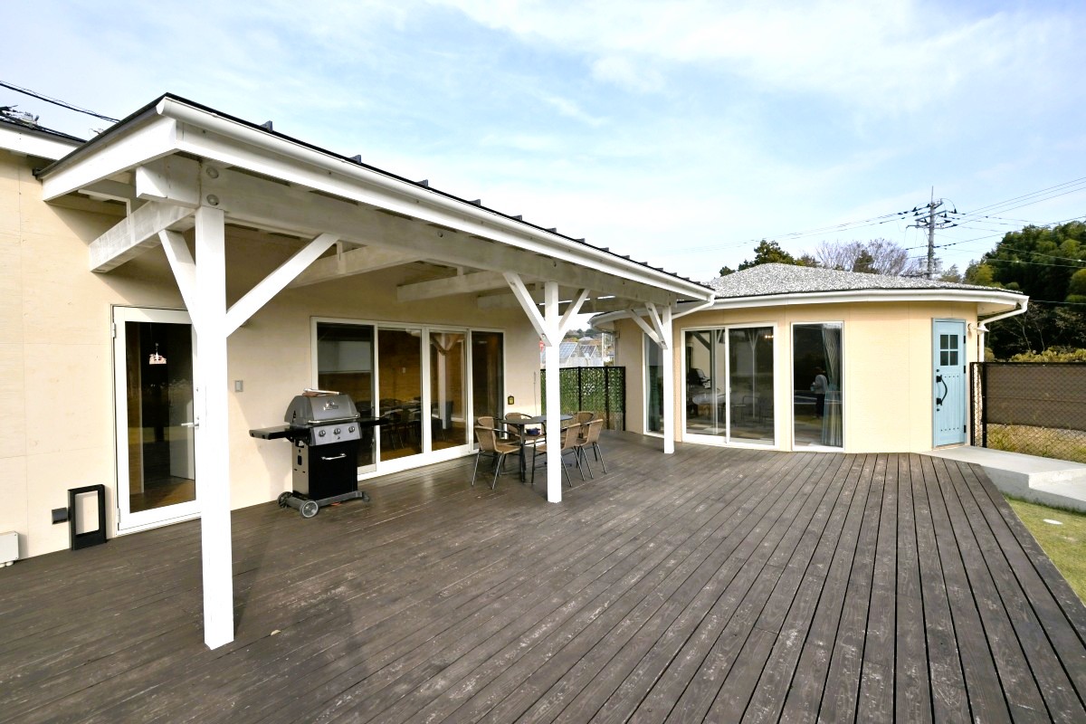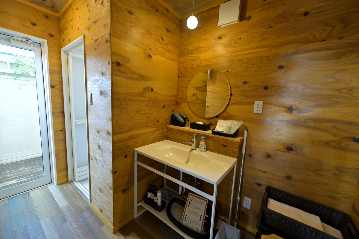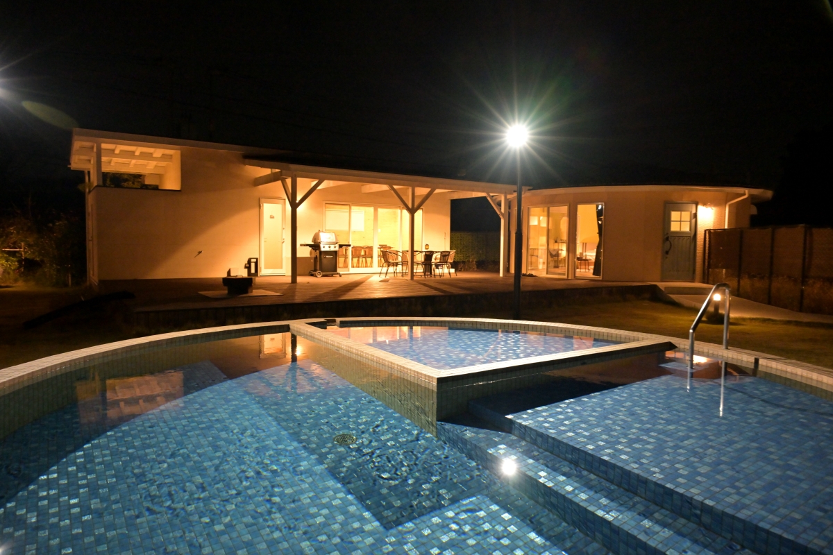 ドッグランコテージと呼ばれるコテージCは、ベッドルーム(ベッド2台)、リビングスペースとなるコテージ部分(ヴィラとコテージはTVあり)と、BBQガスコンロ、焚火台もあるテラスを介してすぐ隣にある(テラスに屋根があるので雨でも濡れずに移動可)別棟のダイニング、ミニキッチン、パウダールーム、シャワールーム、半露天の温泉、そして芝生の高低差あるドッグラン、人間用と愛犬用のプールで構成され、まさに気軽なアウトドアをプレミアムな感覚で楽しむのにもってこい。敷地内へのドアにも鍵がかかるので、セキュリティ面でも安心です。