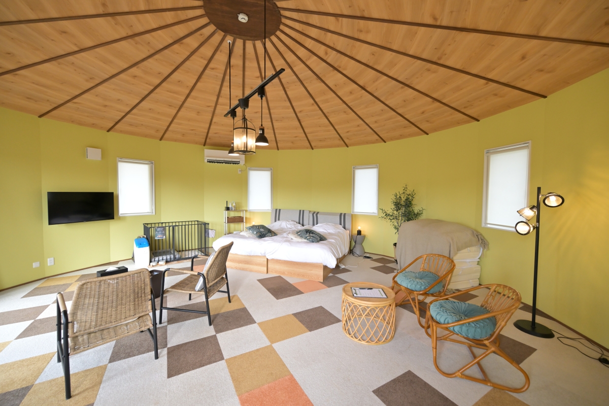 エアコンの効いたコテージ、別棟は快適そのもの。別棟のダイニング&キッチンスペースには6人掛けのダイニングテーブル、冷凍冷蔵庫、も備わっているため、持ち込みの食材(素泊まりの場合)や飲み物を冷やしておくこともOK(セブンイレブンまでクルマで数分です)。