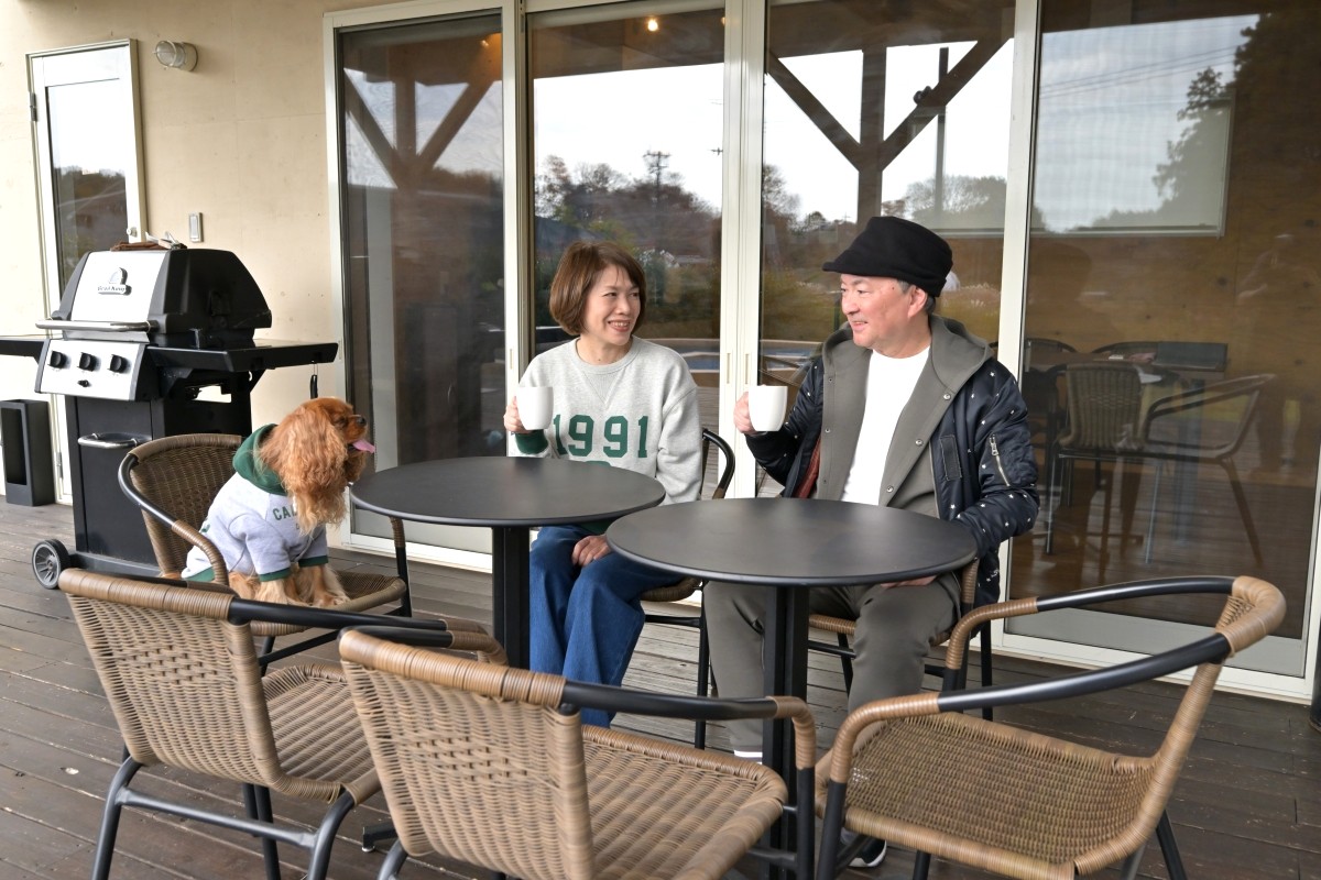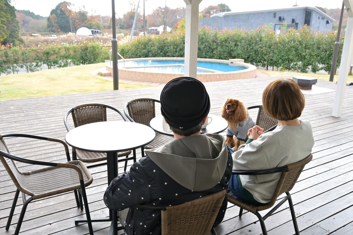 新型デリカミニの快適無比な走行性能によってドライブの疲れを知らないボクたちは、まずはアーモンドをプライベートドッグランで遊ばせ、リフレッシュさせ、冬の午後の暖かい日差しを浴びながらテラスのチェアでまったり。気軽なアウトドアをスタートさせたのでした。夏なら迷わずボクたちもアーモンドもプールに飛び込んだでしょう(一角の浅い愛犬用は塩素なし)。