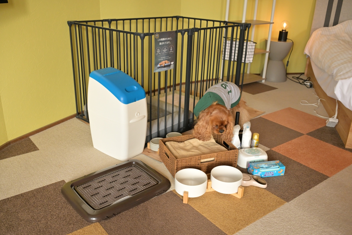 もちろん、愛犬同伴専門施設ですから、お部屋にペットアメニティもしっかりと揃っています。また、駐車スペースもゆったりしていて、クルマ3台は楽々駐車できる余裕ある広さでした。