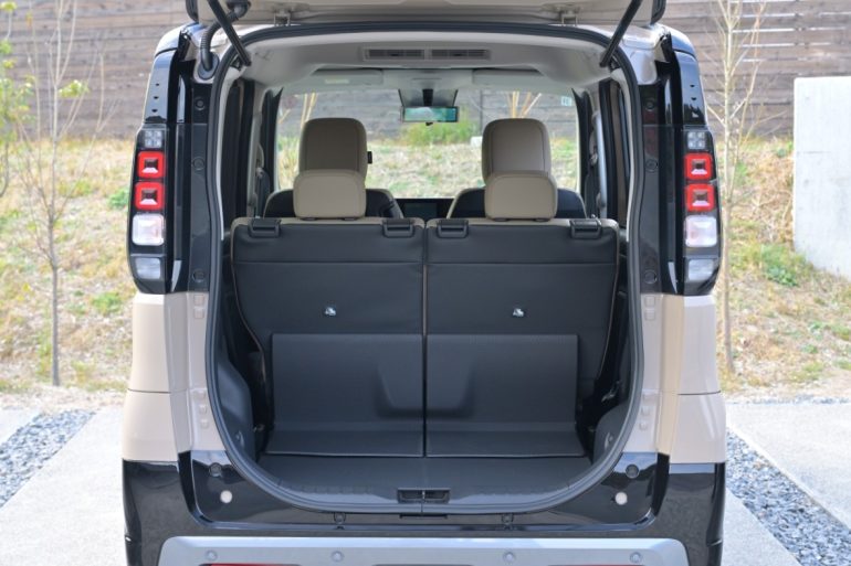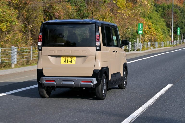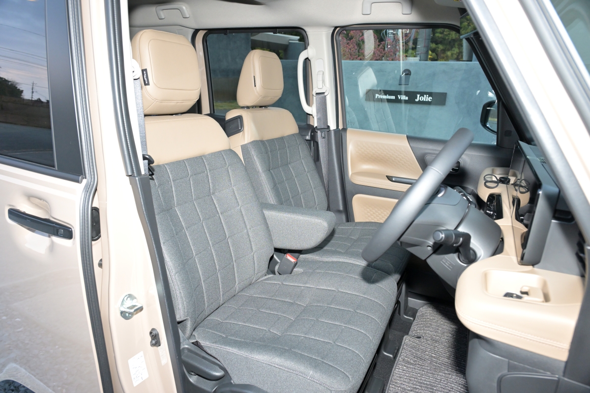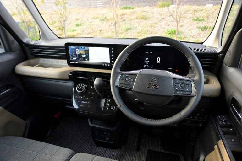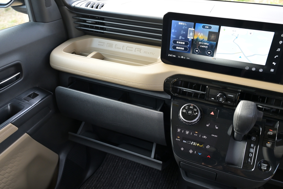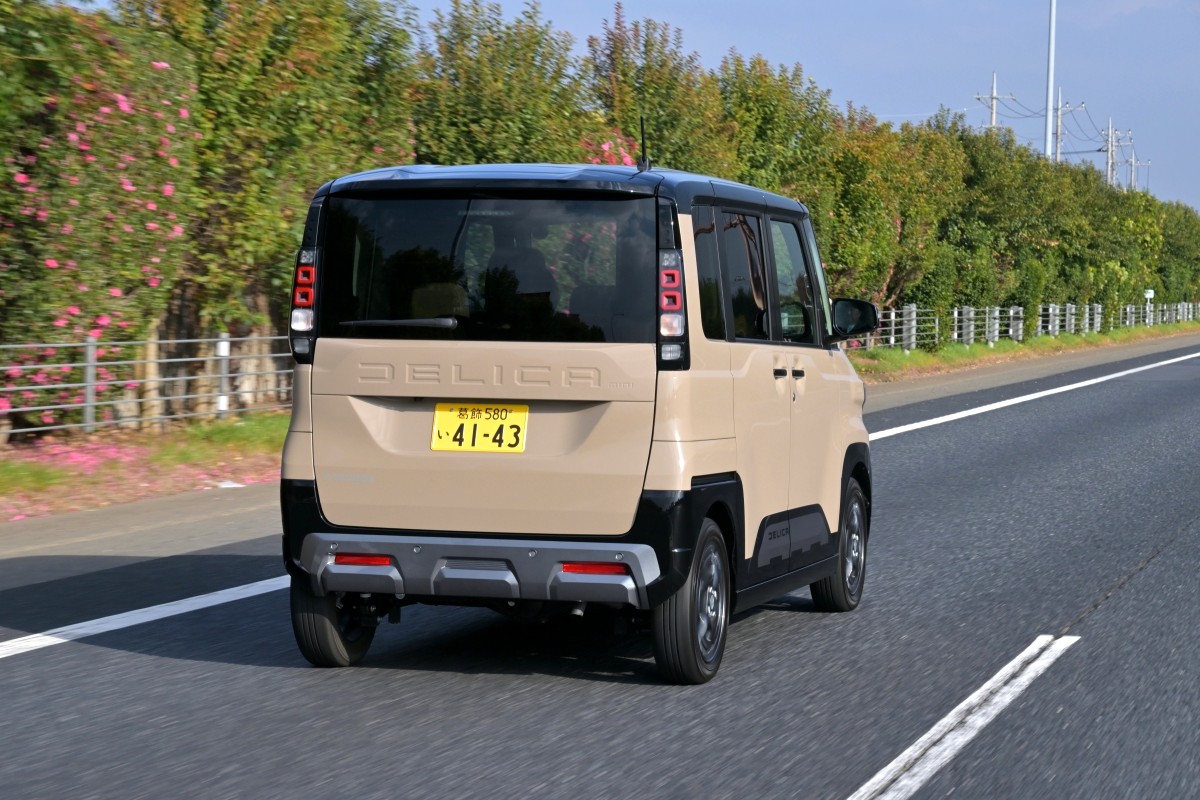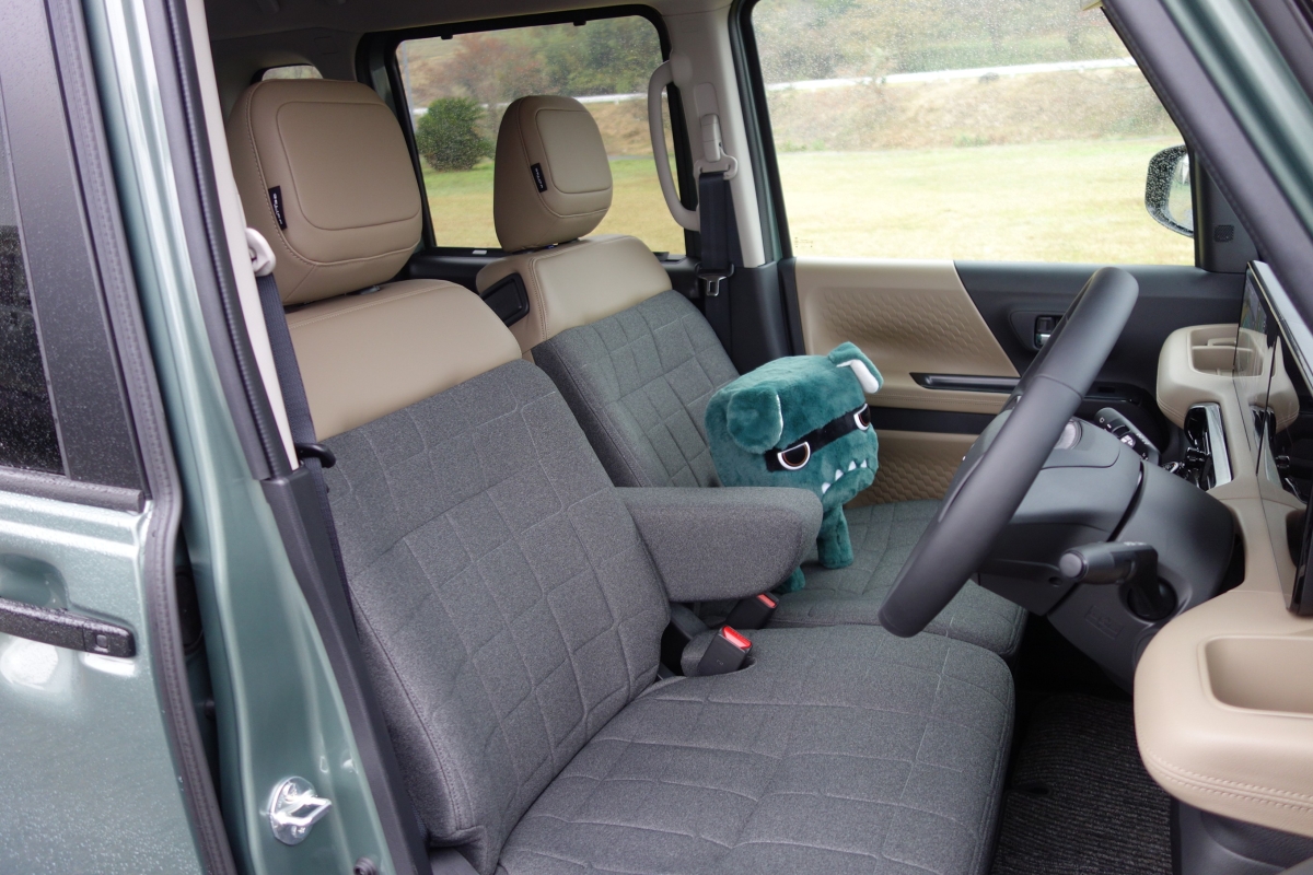 それにしても、新型デリカミニの室内空間は広大で快適そのもの。身長172cmの筆者のドライビングポジション基準で、ソファ感覚のかけ心地と心地よいホールド感を両立させた前席の頭上に約260mm、これまたソファ感覚のかけ心地が得られる後席の頭上に約250mm、膝周り空間に最大400mm(後席スライド後端)もあり、後席のシート位置が高め(フロアからシート座面先端までの高さ約380mm)のため、ごく自然な椅子感覚で座れ、着座性、立ち上がり性ともに文句なしなのです。
